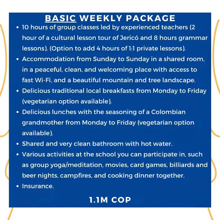 Spanglish Colombia ha vista sulle montagne, wifi gratuito e parcheggio privato gratuito, ambientato a Jicericó.La proprietà presenta viste da giardino e città.Gli ospiti possono utilizzare una terrazza.C'è anche una sala da pranzo e una cucina completamente attrezzata dotata di forno, piano cottura e attrezzi da cucina.Alla guest house, le unità sono dotate di un guardaroba e un bagno in comune.C'è uno snack bar, bar e salone.Per gli ospiti con bambini, la guest house offre un'area giochi al coperto e attrezzature da gioco all'aperto.Gli ospiti possono anche rilassarsi in giardino.L'aeroporto più vicino è l'aeroporto di Olaya Herrera, a 91 km dalla Colombia Spanglish.